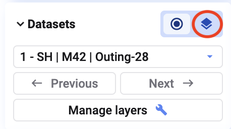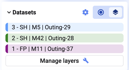The Manage Datasets dialog allows you to customize the appearance of your datasets or layers for better visualization. You can access this dialog by clicking the **Manage Datasets** button in the **Datasets** dialog in the bottom left of your window.