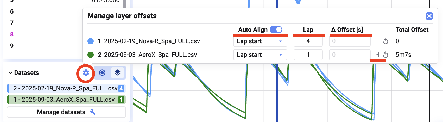 * **Set an offset** between two datasets to align time or event markers for more precise comparisons. You can also use the Second Cursor to create this offset (see [#placing-a-secondary-cursor](https://docs.marpledata.com/docs/marple-insight/user-manuals/plot-types/time-series/cursors#placing-a-secondary-cursor "mention"))