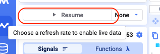 To disable the live view realtime data, simply set the refresh rate to `None`. The live banner will then show the *Resume* status.
