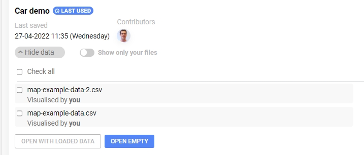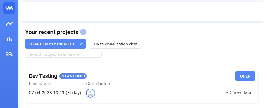 In this view you will be able to open a Project, either empty or load it with some data visualised by you or one of your team members.